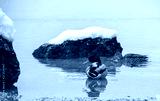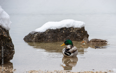 Male and female ducks swimming in a calm lake water with rocks covered in snow around them
