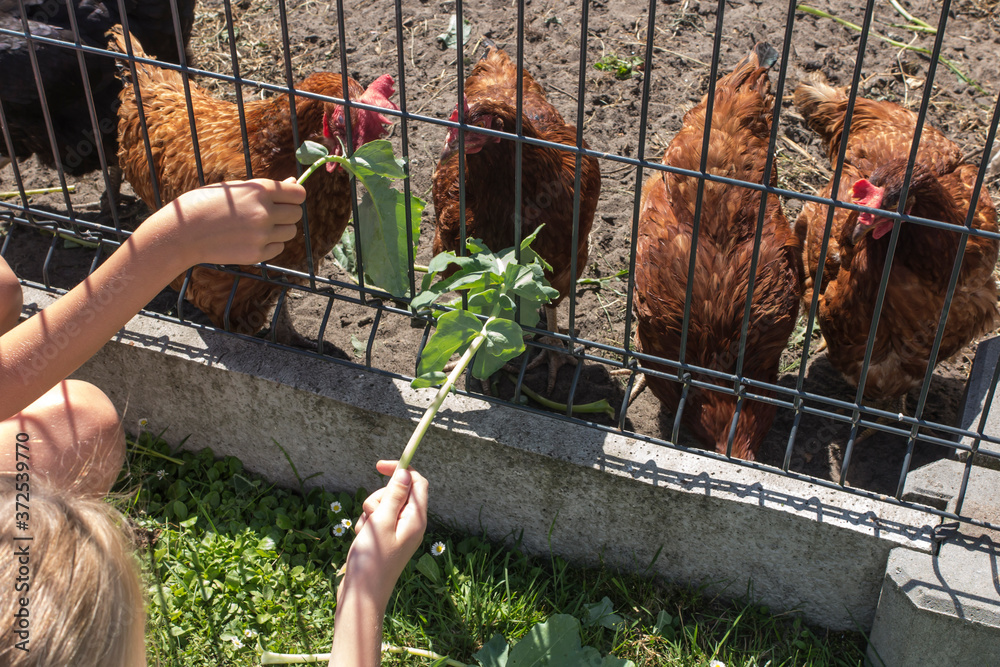 the children feed the chickens that are behind the wire mesh fence with the frava and leaves of