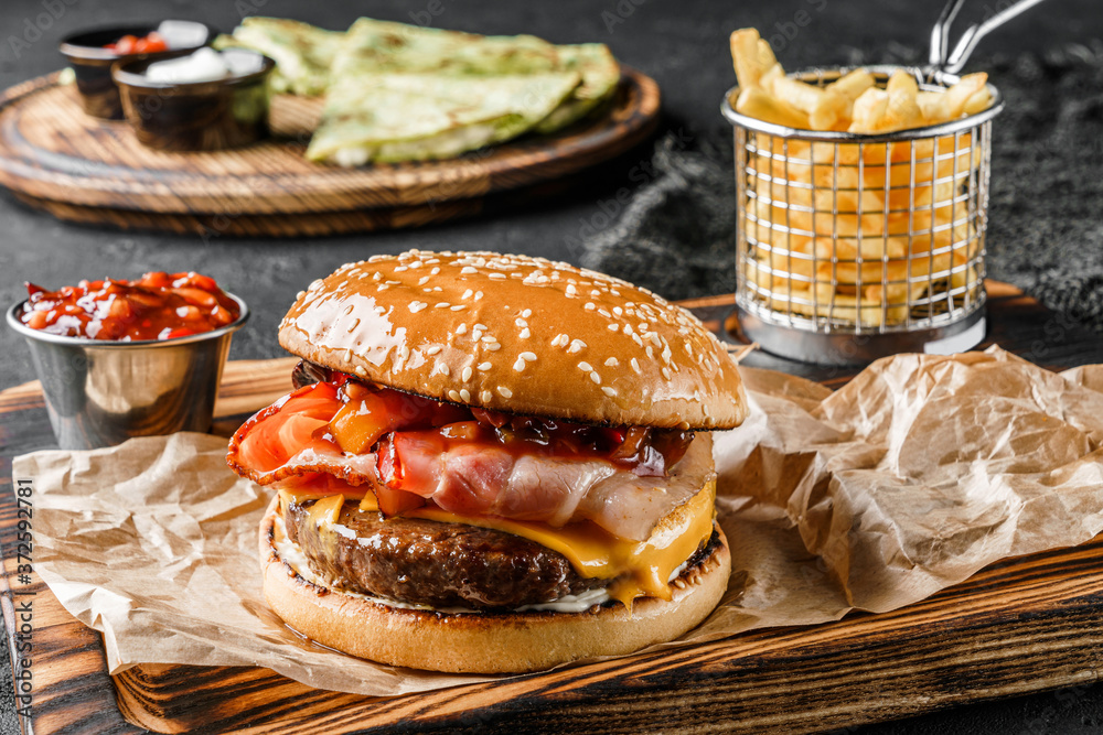 Tasty burger with beef meat cutlet, slice of cheese, ham and spicy sauce on wooden board with french fries potatoes on black background. Fast food lunch, close up