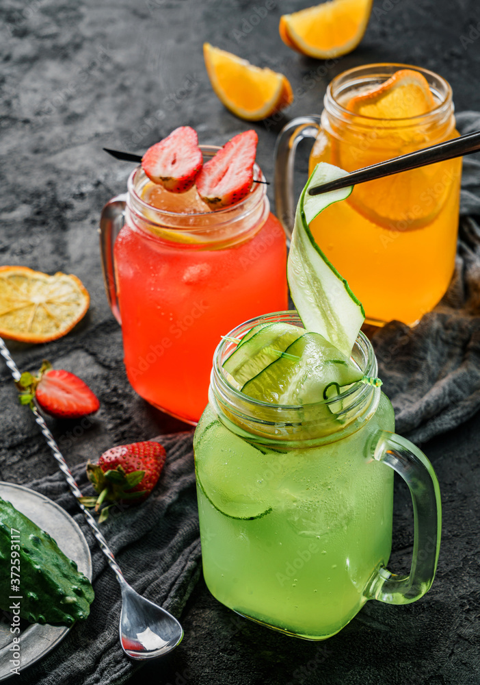 Variety of fresh summer lemonades with strawberries, cucumbers and orange in glass jars on dark stone background. Summer cold drink and cocktail