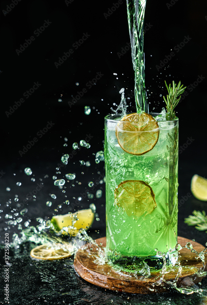 Fresh Mojito cocktail with lime, rosemary, mint and ice in jar glass on dark background. Studio shot of drink in freeze motion, drops in liquid splash. Summer cold drink and cocktail