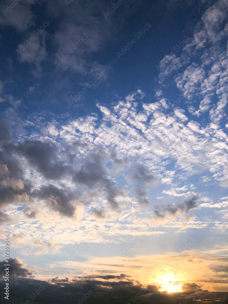 雲と太陽のある夕暮れの青とオレンジのグラデーション