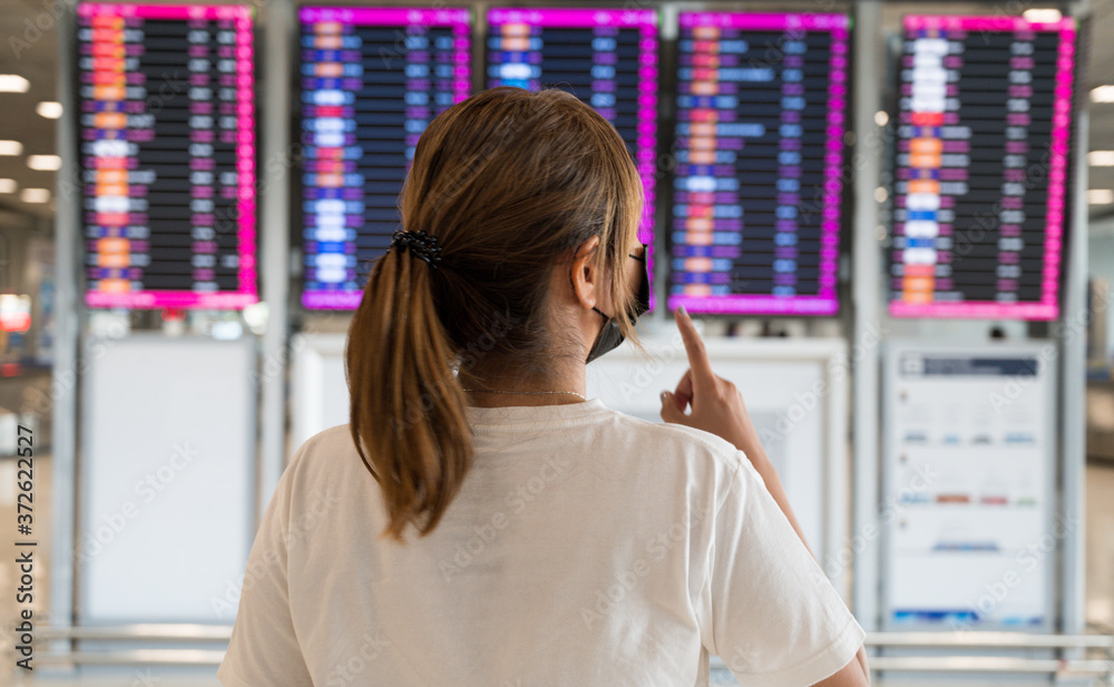 Beautiful young tourist girl wearing face mask looking airline flight status near flight information board in airport during covid-19 virus outbreak a new normal concept