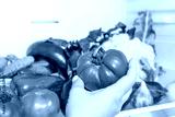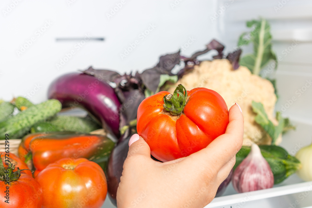 Woman taking fresh tomato from the refrigerator at home, Woman takes tomato from the open refrigerator. close-up view