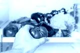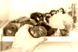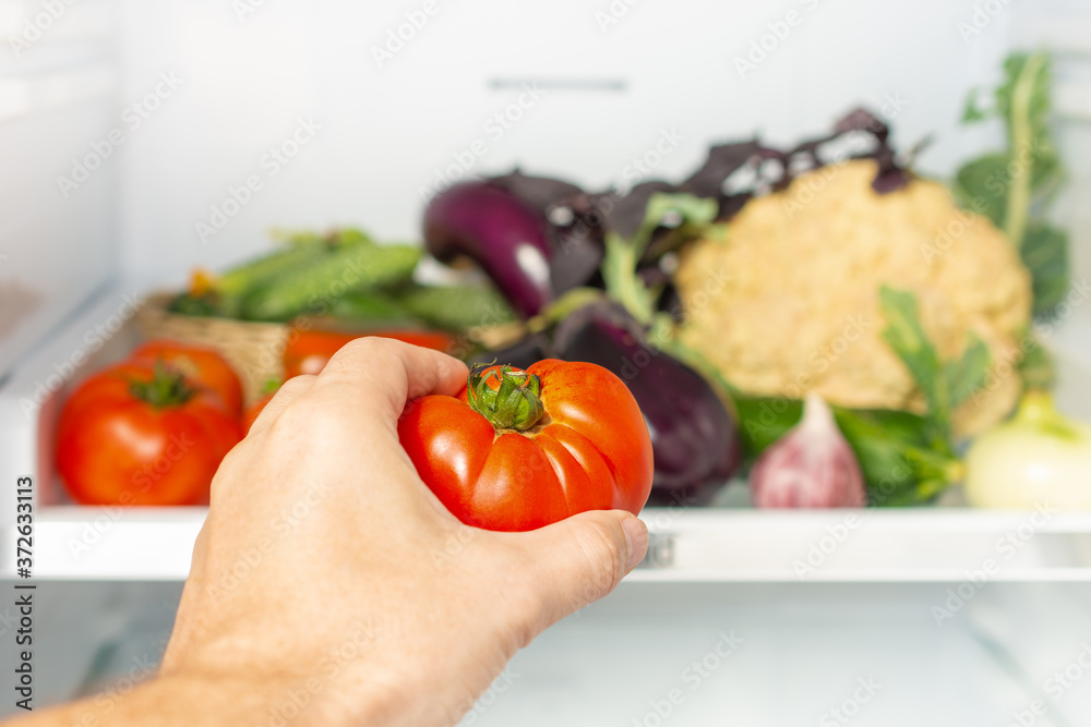 Man takes the tomato from the open refrigerator. refrigerator is full of vegetables and herbs. Healthy food.