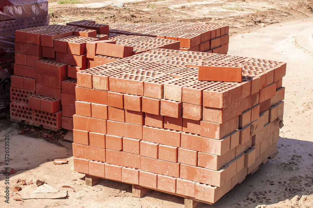 The red bricks are stacked on wooden pallets and prepared for sale. red bricks on a construction site