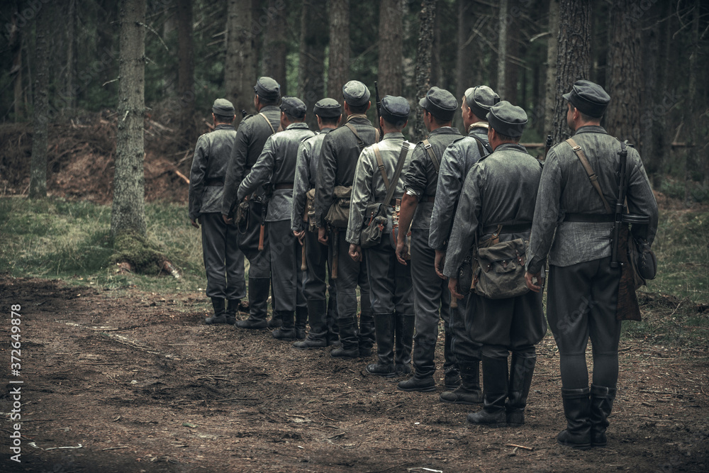 Build soldiers of the Finnish army on the line in the forest.Military reconstruction.