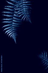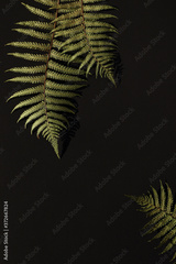 Green fern leaves on black background, leaves casting deep shadow. Autumn mood background for custom text.