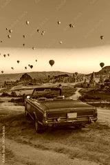 retro car on cappadocia and hot air baloons