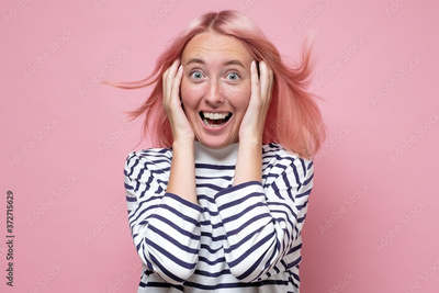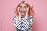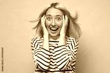 Beautiful mixed race businesswoman smiling with open mouth and open palms