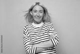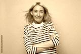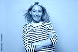 Beautiful mixed race businesswoman smiling with open mouth and open palms