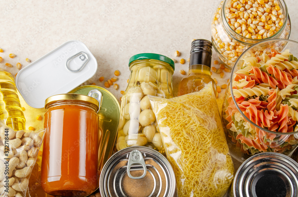 Flat lay view at kitchen table full with non-perishable foods. Spase for text