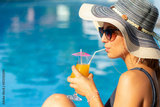 Portrait of cute woman enjoying fruit cocktail next to pool