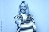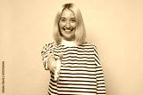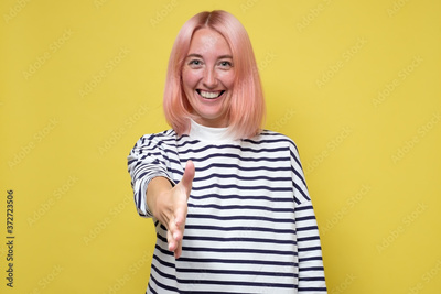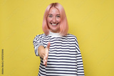 Young caucasian woman in striped sweatshirt giving hand to handshake