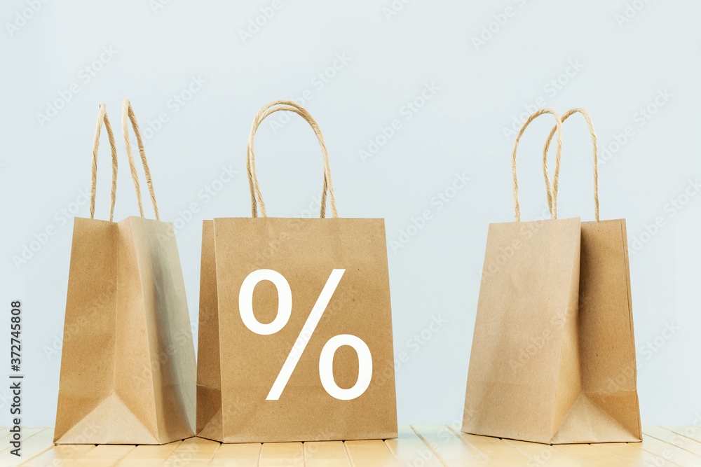 Three buff plain paper carry bags with percentage sign on grey. Delivery service of goods and grocery, shopping courier. eco friendly packaging, plastic free takeaway. Shopping and sale. Copy space
