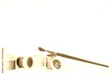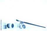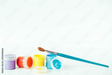 Colorful gouache paints and brush for painting on white wooden table. Copy, empty space for text