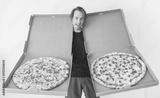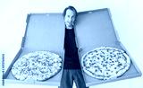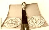 New York style pizzas takeout. Delivery man showing funny oversized pizza boxes delivery fast food from restaurant to home.