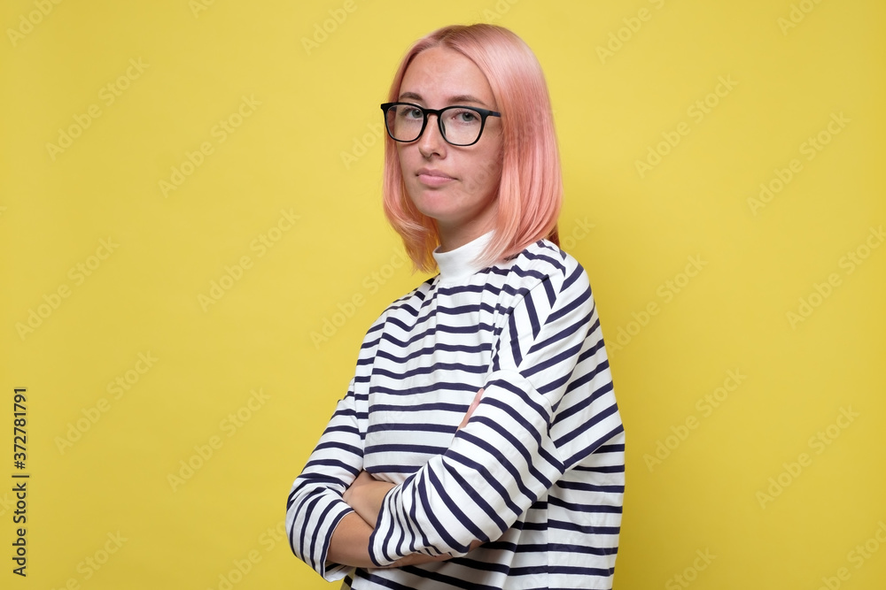 Confident woman with pink hair wearing striped clothes looking at camera
