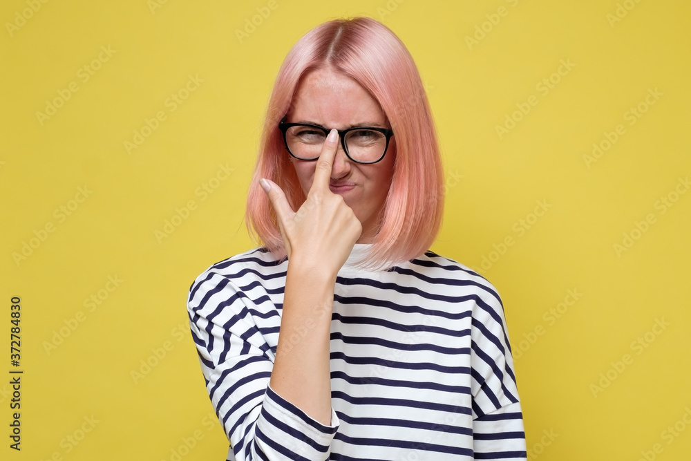 Exhausted millennial caucasian girl taking on uncomfortable glasses.