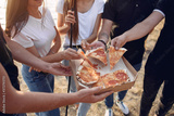 Group of friends is sitting near the lake. They wear casual clothes. Young people eat pizza outside.