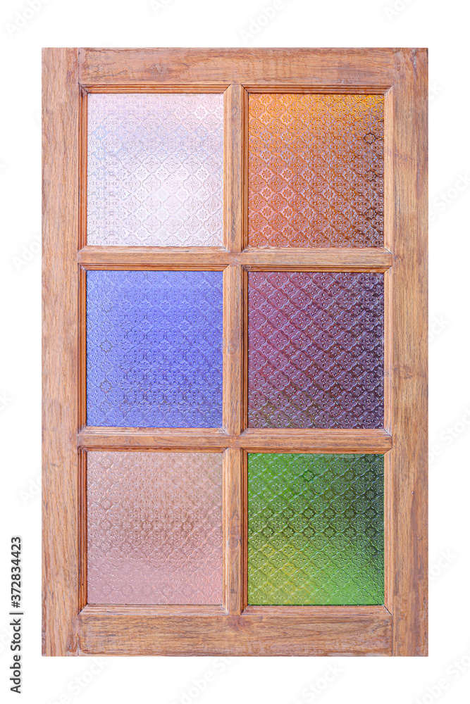 Old wooden window with colorful glass isolated on white background with clipping path included.