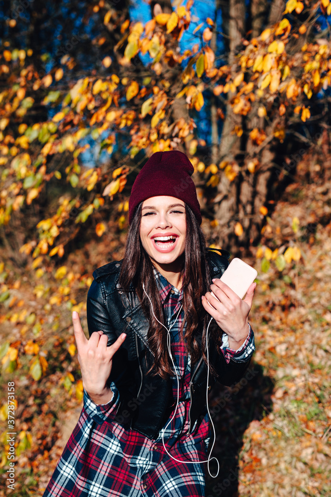Beautiful girl listening to music on smartphone and having fun in autumn park