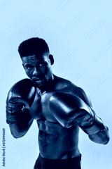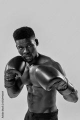 Portrait of young muscular african american male boxer looking at camera, wearing boxing gloves, standing isolated over grey background. Sports, workout, bodybuilding concept