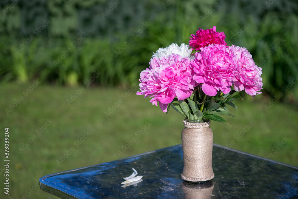 Bouquet of pink and white peonies flowers in a vase on a table in the summer outdoors.