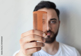 Male hand holding beard comb
