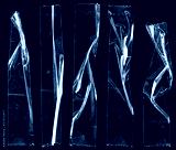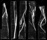 set of transparent adhesive tape or strips isolated on black background with blood remain, crumpled plastic sticky snips, crime poster design overlays or elements.