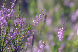 Macro shot of flowering heather or ling (lat. Calluna vulgaris) in the forest at sunny summer day