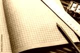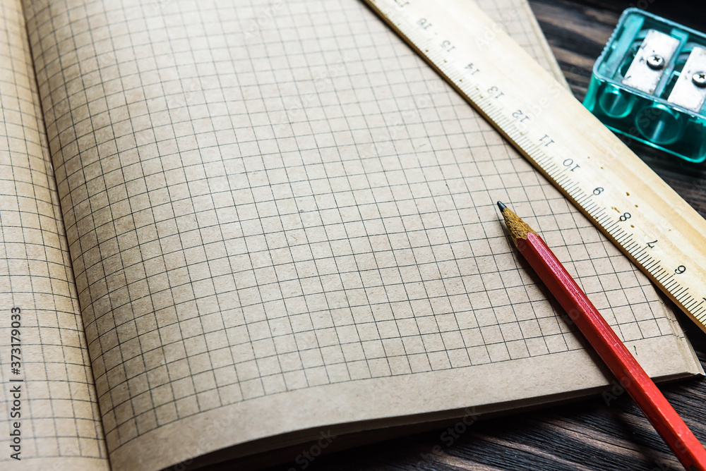 Graph paper of notebook background, blank page of retro sketchbook and pencil.