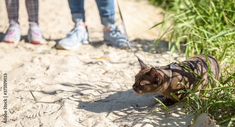 Playful Burmese cat wearing harness and its owner on beach, young brown cat with leash plays on sand.