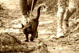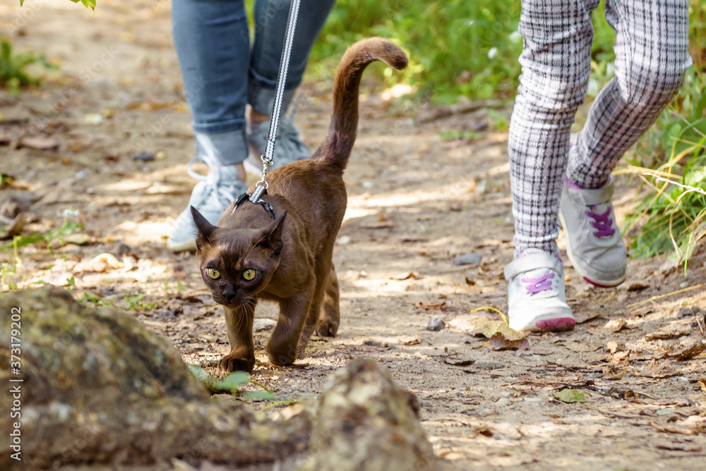 Burma cat wearing harness and its owner in summer forest or park, young brown cat with leash and child go on path.
