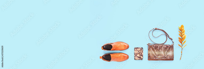 Fall clothing. Pair of trendy fashion orange chelsea boots and animal print leather bag and purse on blue. Bright autumn accessories bloggers concept with copy space. Flat lay banner