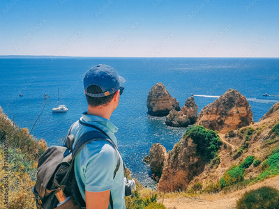 Male tourist enjoying the beautiful view, Ponta da Piedade, a scenic spot in Portugal