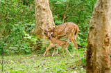 A small deer dove suckling mom spotted deer for milk inside Nagarhole national park during a wildlife safari