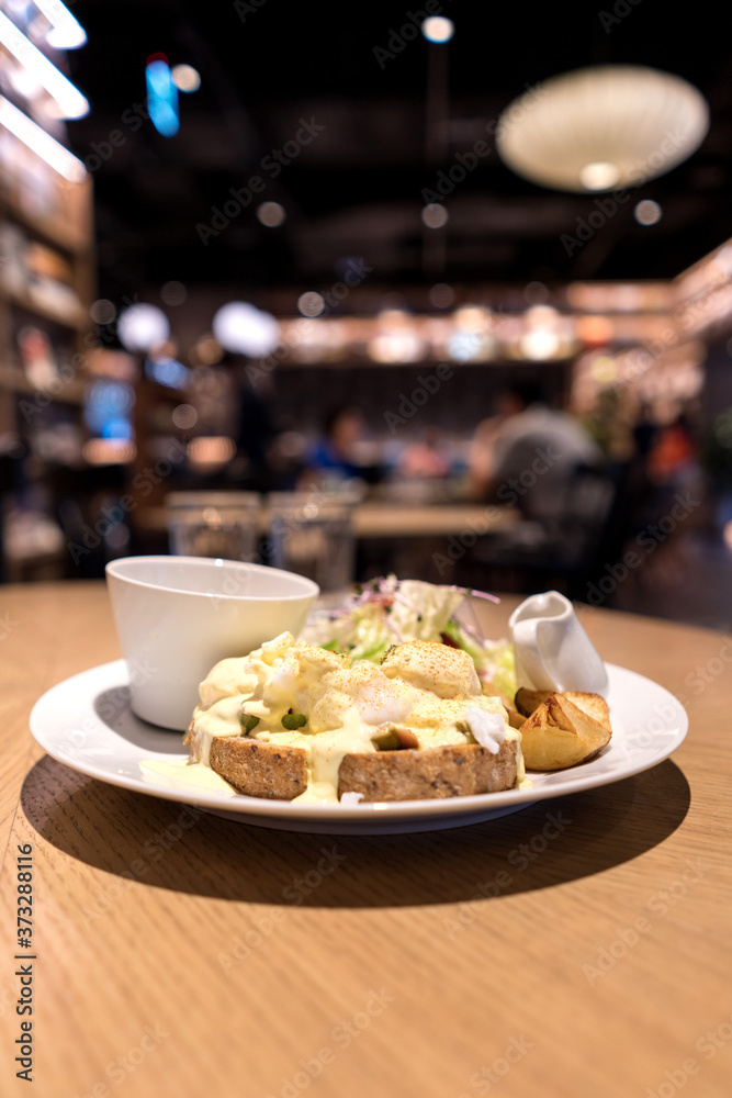 Substantial breakfast with fried egg, salad, bread and coffee, top view