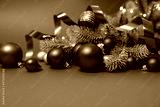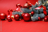 Winter holidays concept. Red, gold Christmas decorations on a red background with a Christmas tree, bokeh lights. Festive Christmas card. Happy New Year theme for layouts. Space for text. Horizontal