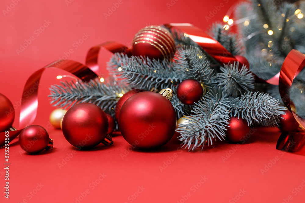 Winter holidays concept. Red, gold Christmas decorations on a red background with a Christmas tree, bokeh lights. Festive Christmas card. Happy New Year theme for layouts. Space for text. Horizontal