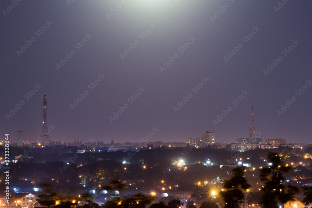 Night time city lights panorama in purple romantic colors. Big city lightened with bright moon light. Colorful moody clear sky night view on Kharkiv, Ukraine
