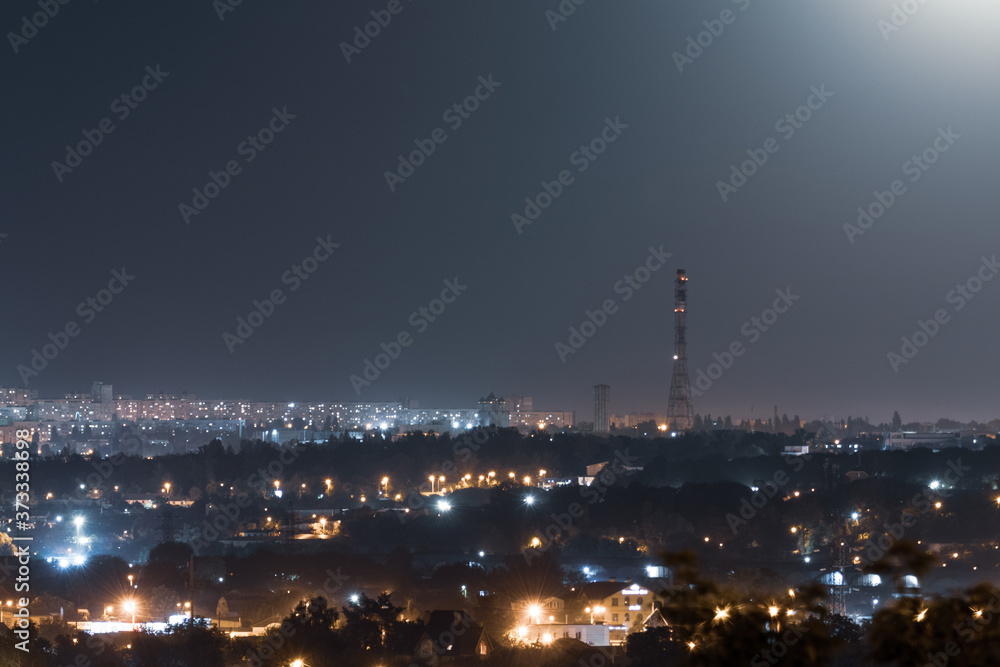Night time city lights blue colors dark sky panorama. Big city lightened with bright moon light. Colorful romantic clear sky night view