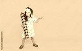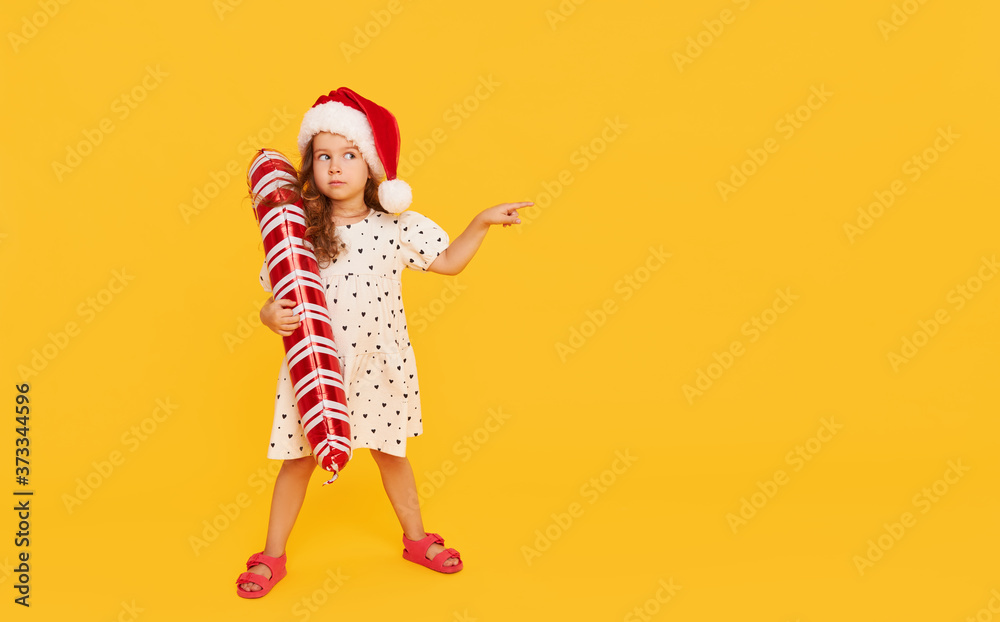 A cute little girl child in a smart dress and a Santa hat holds an inflatable shape of a candy cane on a yellow background. 2021 new year holidays concept and childrens new year gifts advertising