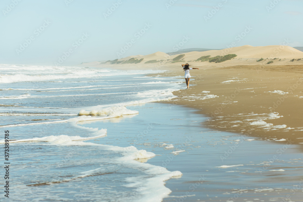 Woman happy to see ocean. Inspiration and freedom. Running to the sea by sand beach.