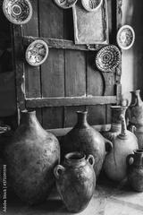 Many unique handmade clay jugs and vases on local arabian market. Souk in medina Marrakech.