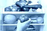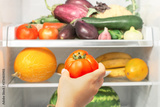 woman's hand picks up tomato from the refrigerator shelf. healthy food. healthy lifestyle concept