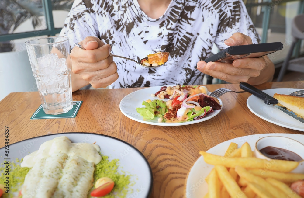 Selective focus of Man hand using and looking at his smartphone as having foods of lunch in the restaurant with friends.