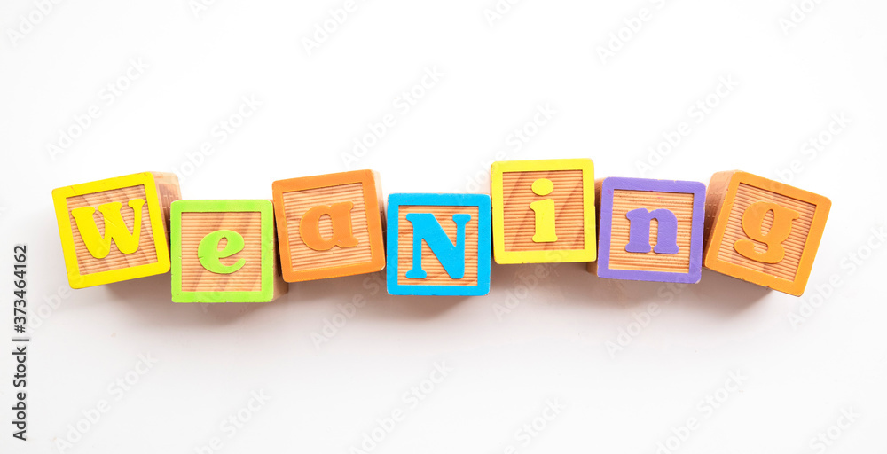 Weaning word made from colourful wooden baby development blocks