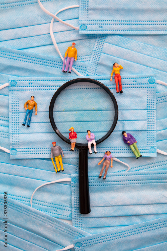 Covid health investigation. People on a mask and magnifying glass