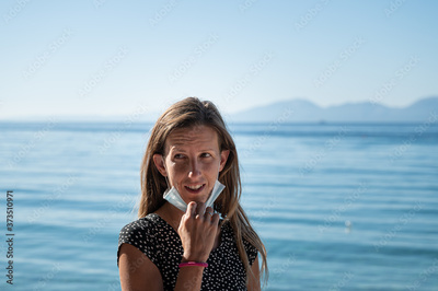 Young woman standing by the sea taking off her medical protective mask